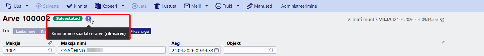 Salvestatud uue kujundusega arve päises kuvatakse info ikooni koos selgitusega „Kinnitamine saadab e-arve (rik-earve)“ ehk sulgudes on ka märge, et mis operaatoriga on tegu.