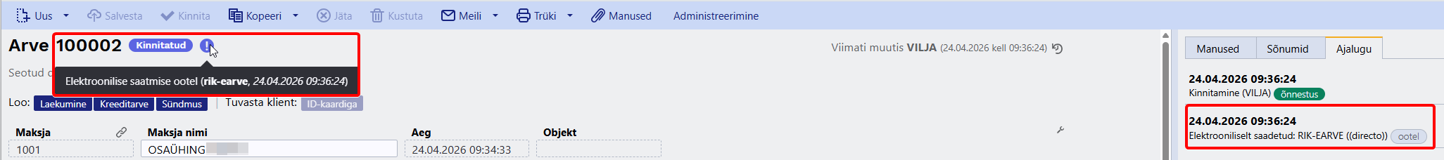 Peale arve kinnitamist kuvatakse koheselt uut info ikooni koos selgitusega, et arve on elektroonilise saatmise ootel. Samuti kuvatakse see info külgpaneeli Ajalugu sektsiooni.