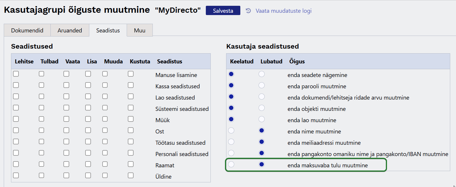 Kasutaja seadistuste all tuleb määrata töötajale MyDirecto nimeline kasutajagrupp ning lubada töötajale ainult ID-login.