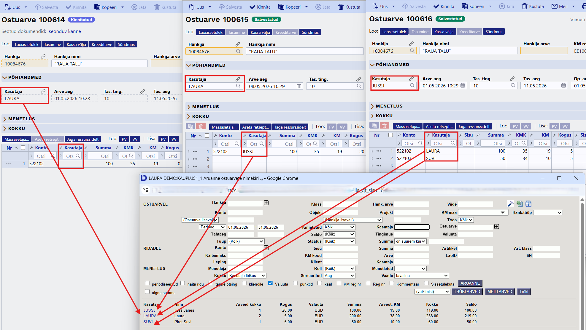 Näide 1: Perioodis ja filtritele vastab 3 ostuarvet - kuidas kujuneb kulurea kasutaja: