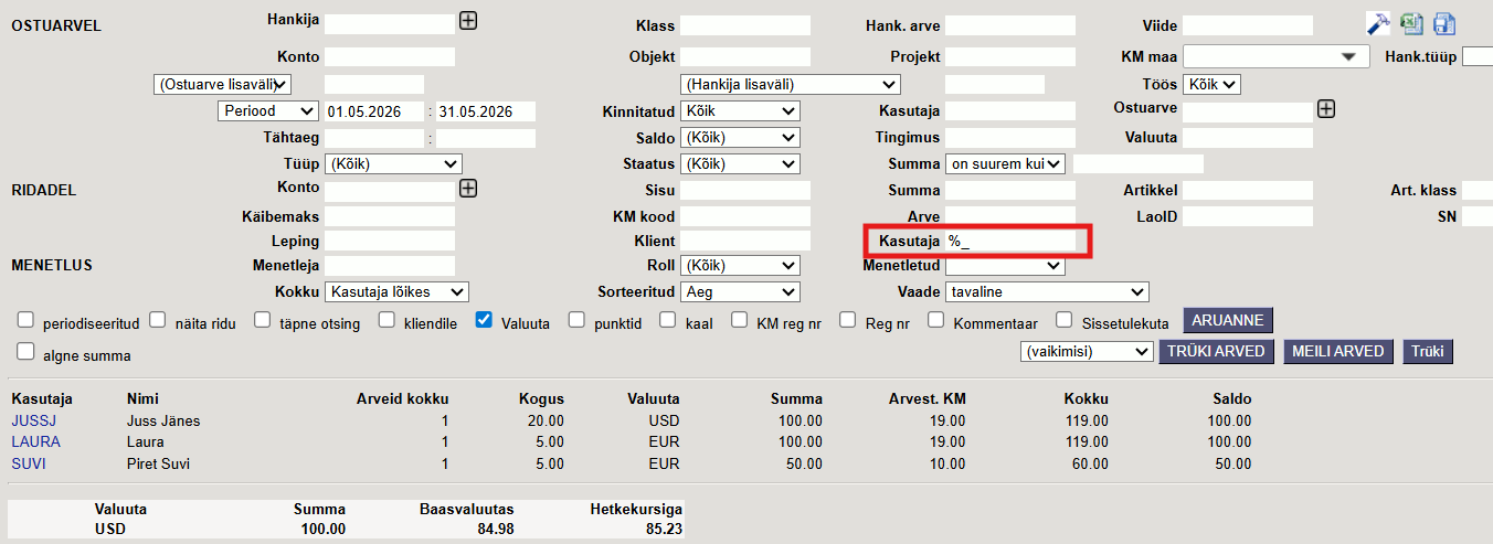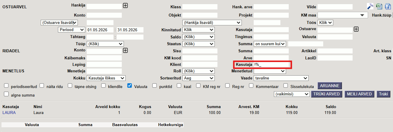 Näide 3. Ainult ostuarve päise kasutaja lõikes (rea kasutaja tühi).
