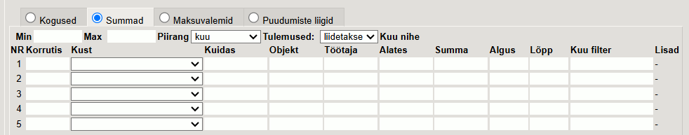 Piirang- määratakse ajaline piirang “Min” ja “Max” summade osas: aasta, kuu, päev.