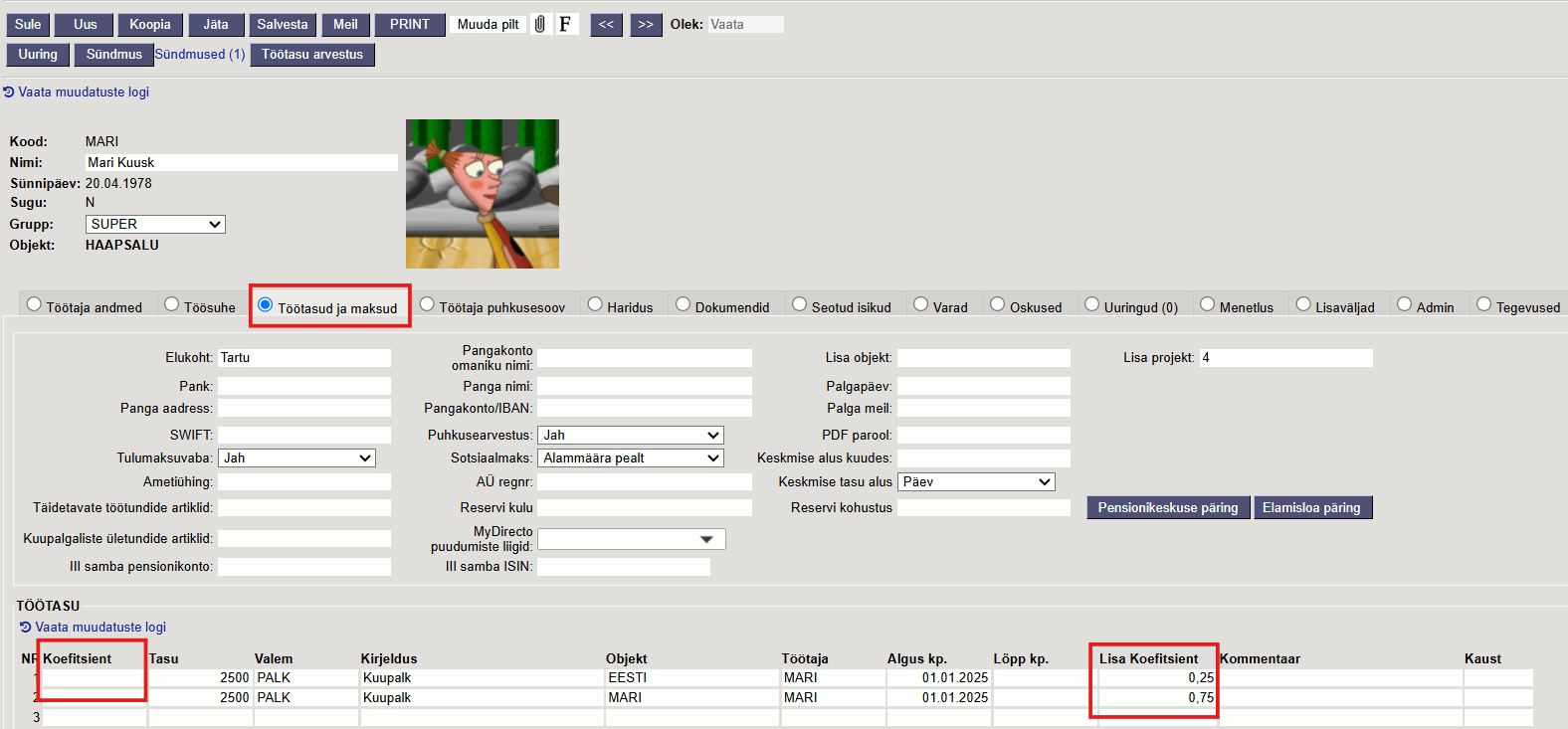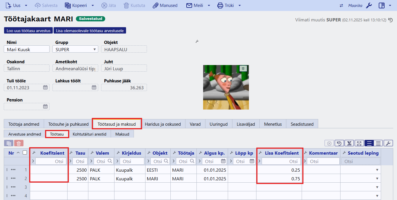 Töötajakaardile koefitsiendi sisestamisel tuleb arvestada, et nende summa peab olema kokku alati 1.