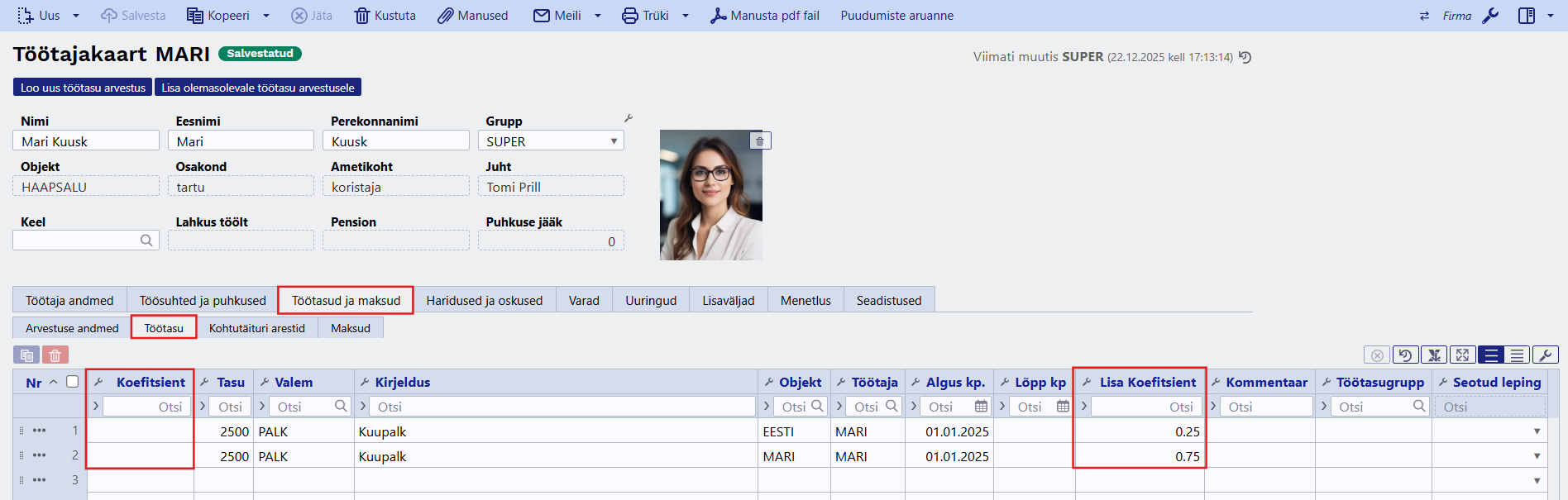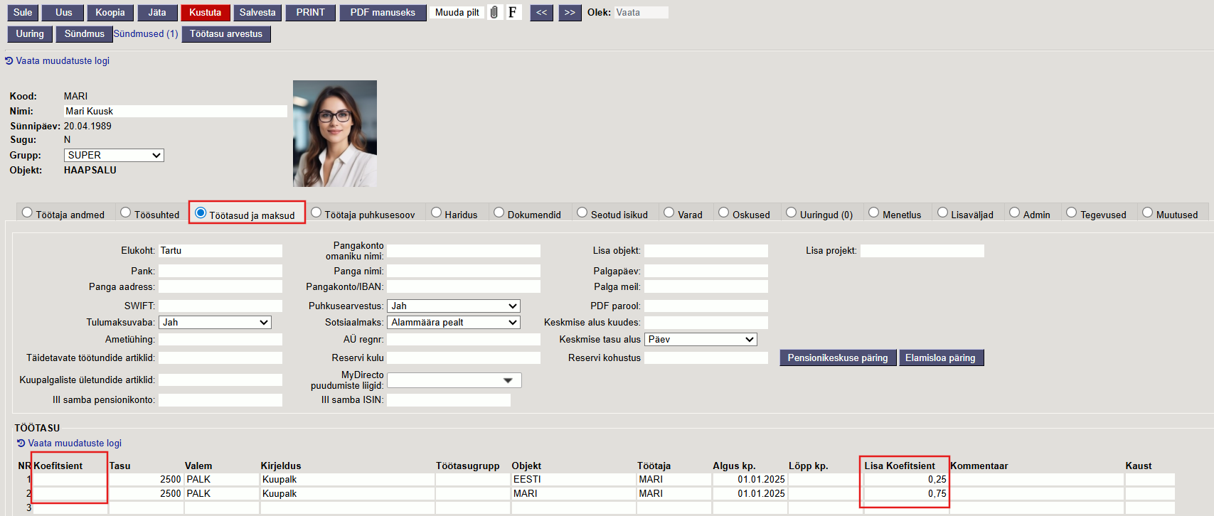 Koefitsient väli on vaikimisi nähtav ja saab koheselt kasutama asuda. Lisa koefitsiendi sisestamiseks tuleb süsteemi seadistustes sisse lülitada seadistus Töötasuvalemil on lisakoefitsient ja üle vaadata seadistus Valemi summa korrutatakse lisakoefitsiendiga läbi.