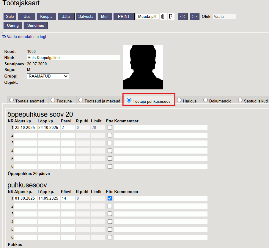 Selle seadistuse tulemusena tekib töötajakaardile uus sakk Töötaja puhkusesoov