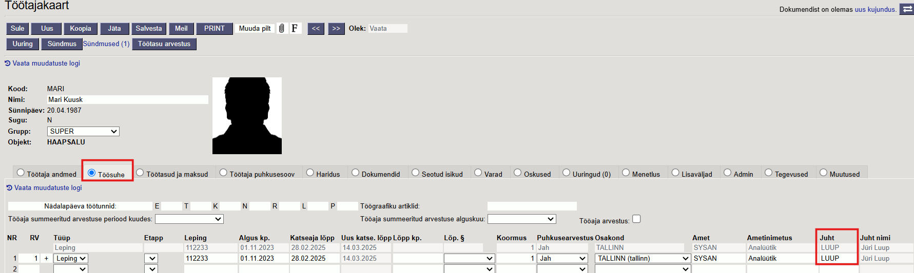 3. Kui on soov, et otsene juht saaks sisestatud soove aktsepteerida, tuleb ära täita töötajakaardil töösuhte sakil juht. Soovitame kasutada ettevalmistatud osakondi ja ametikohti - nii saab töötaja osakonna juurest juba automaatselt juhi külge ning see vahetub programmi poolt ka siis, kui osakonna juures juht ära muudetakse.