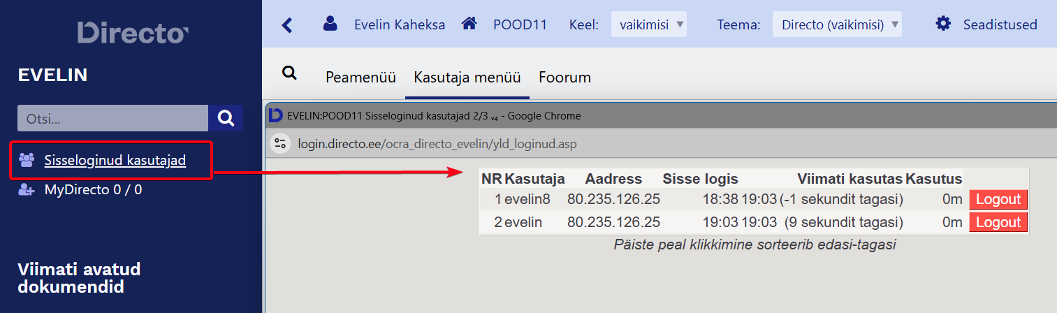 Kasutajale tekib peamenüü külgpaneeli link Sisseloginud kasutajad, mis avab sisseloginud kasutajate nimekirja: