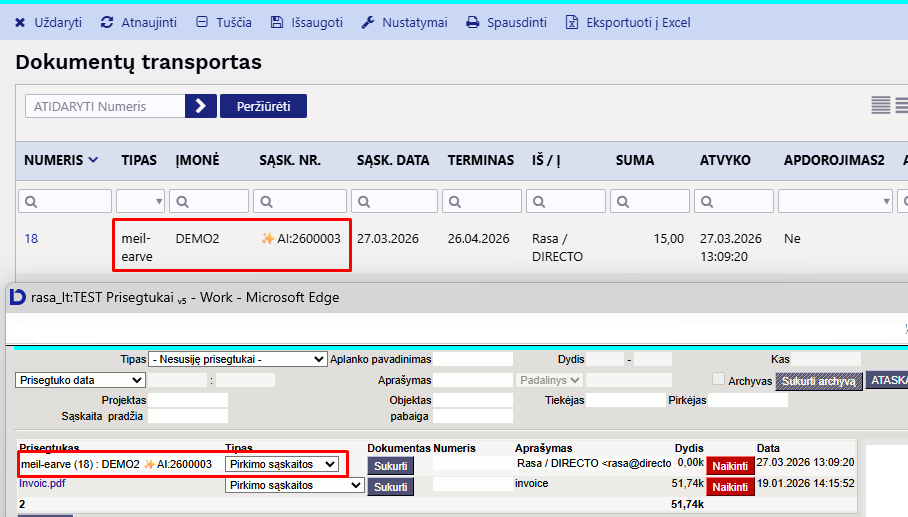 Visos Directo gaunamos e-sąskaitos patenka į dokumentų transporto sąrašą, kurį galima atidaryti eidami į BENDRAS → DOKUMENTAI → Dokumentų transportas.