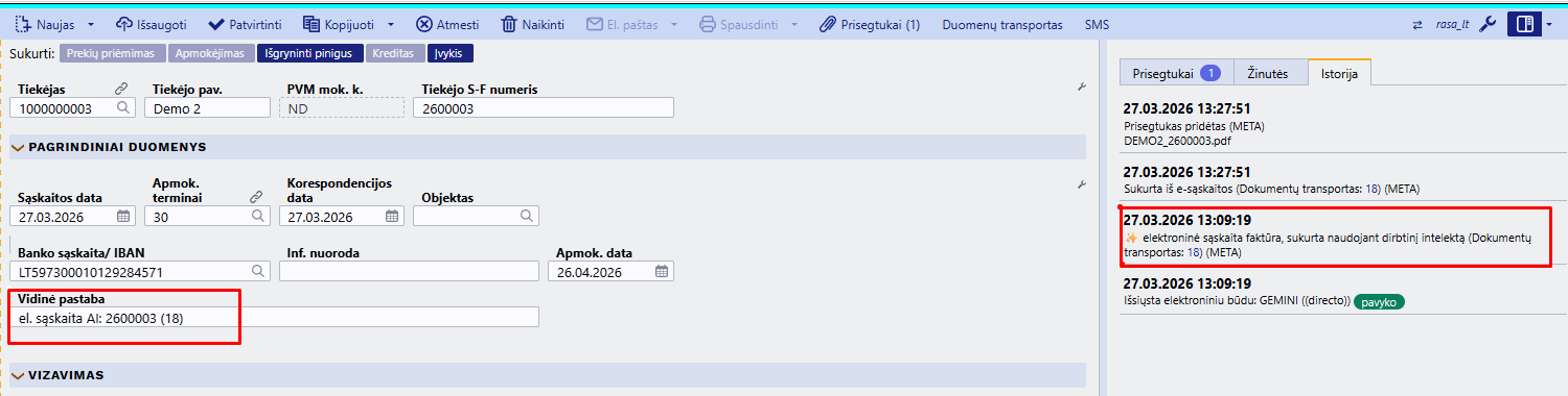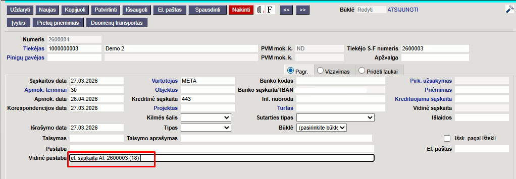 Sukurtoje pirkimo sąskaitoje laukai yra automatiškai užpildyti su informacija iš standartinių laukų e-sąskaitos XML faile. Prie e-sąskaitos prisegti prisegtukai yra taip pat prisegti prie pirkimo sąskaitos.
