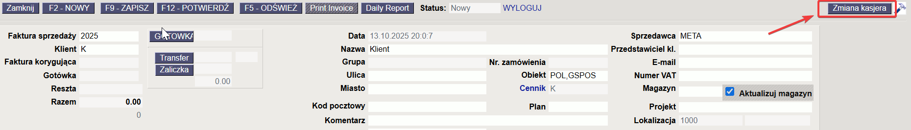 Wprowadzenie tych wartości automatycznie zmniejsza kwotę w polu „Gotówka”.