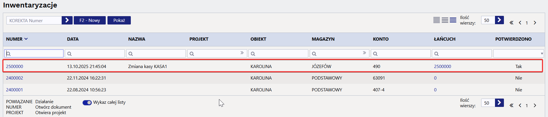 Lista artykułów inwentarzowych zostanie uwzględniona w raporcie, jeżeli w karcie lokalizacji wprowadzono listę towarów do inwentaryzacji (oddzielonych przecinkami).