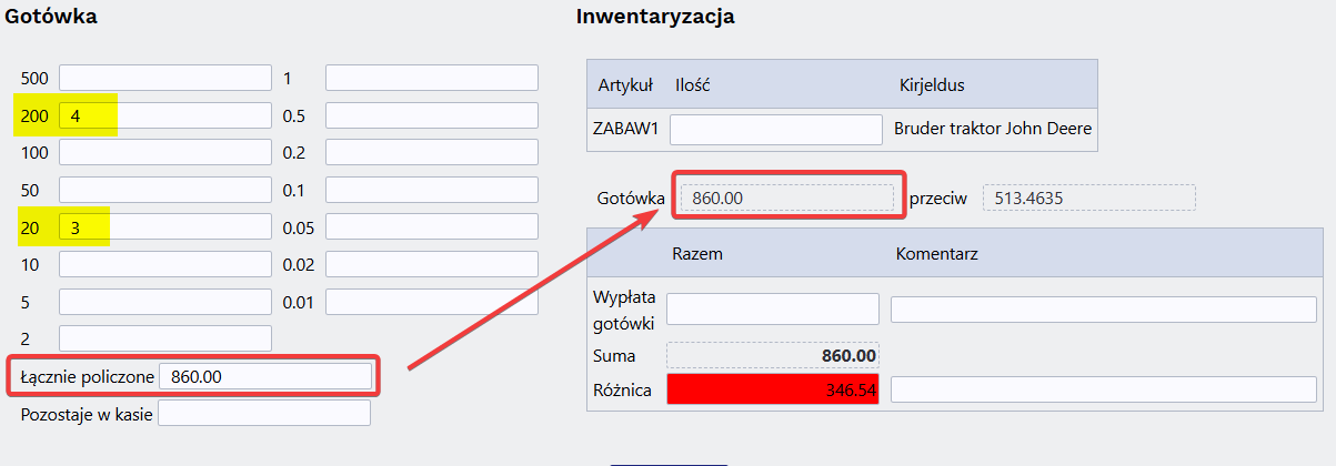 Wartość ta zostanie również automatycznie przeniesiona do pola „Gotówka”.