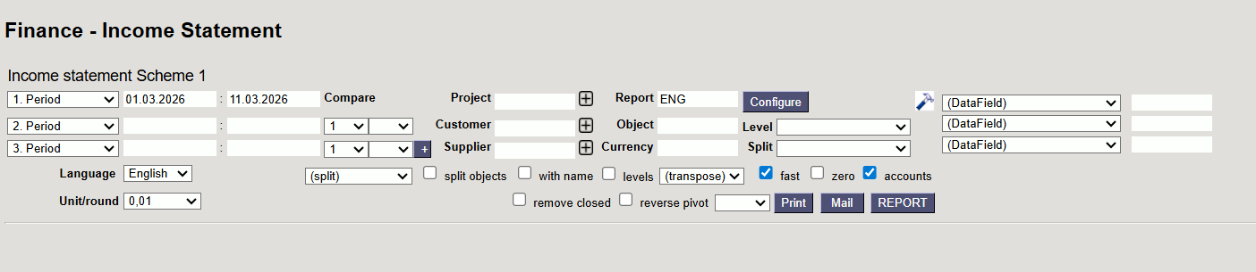 - Report - Report configuration selectable by double‑clicking or using the right mouse button. Configure, change or add reports. If the Report field is left empty and the checkbox Accounts is selected, a simplified income statement can be generated, displaying only revenues, expenses, and the result.