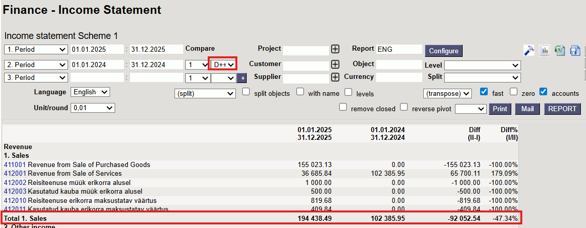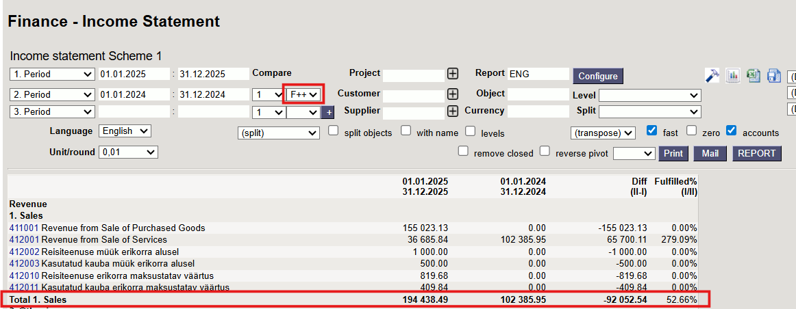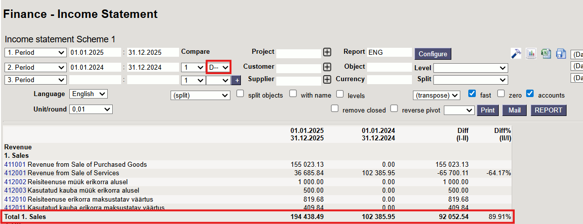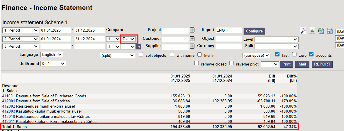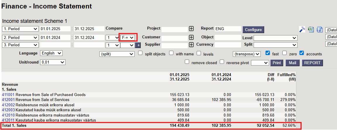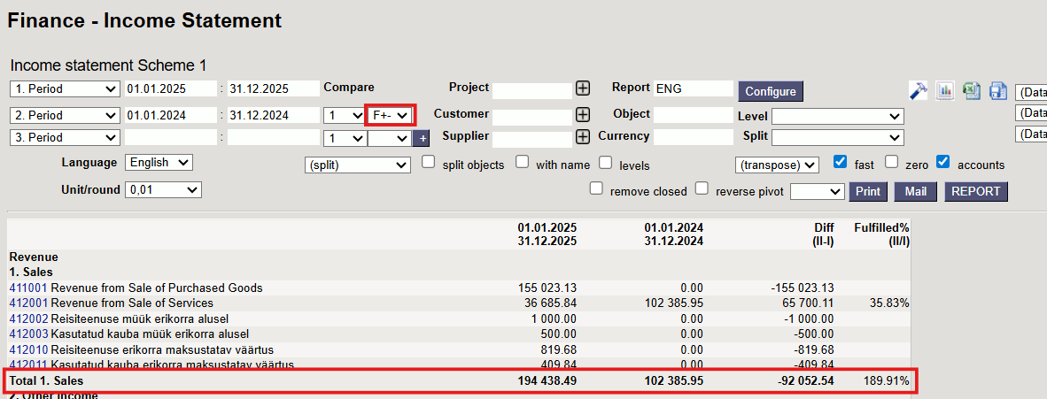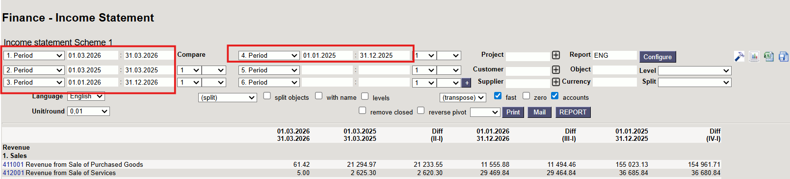 Income statement is an accounting report that shows the firms financial performance (revenues, expenses, and profit or loss) for the reporting period. The income statement presents the changes in the financial accounts configured in the report. Unlimited number of different reports can be configured showing the turnover for the period, For example: