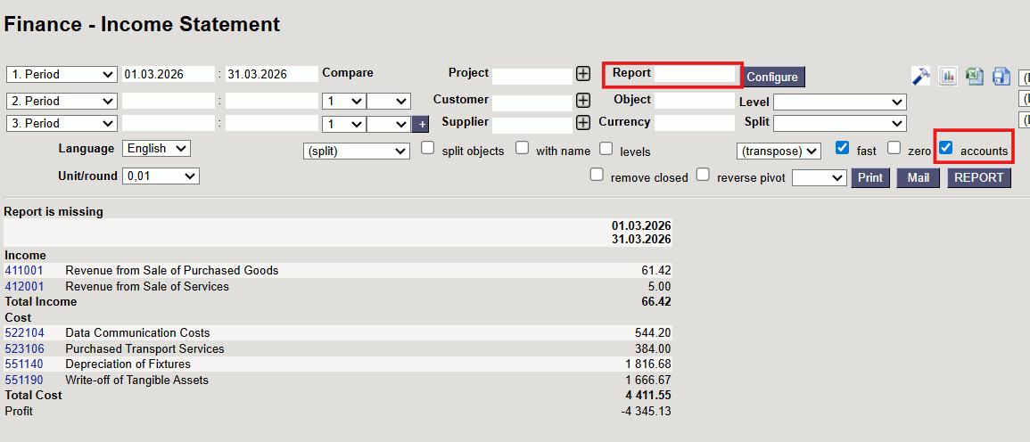 4.1. If zero is selected in the Income statement configuration, it applies to the accounts