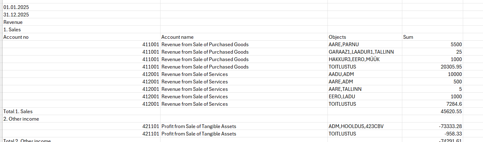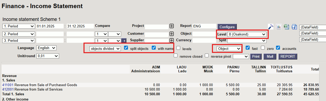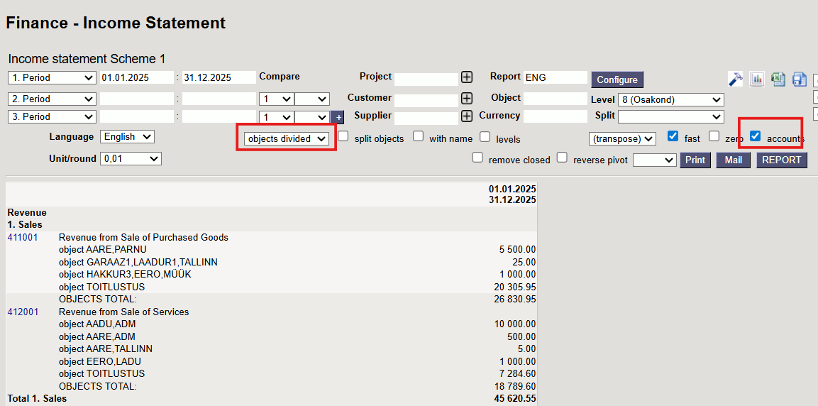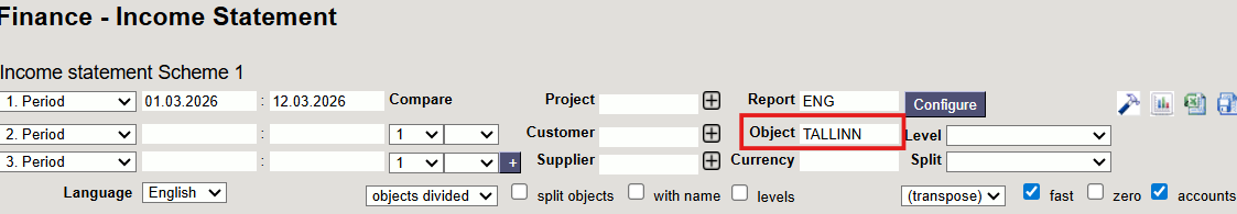 To display the income statement with object details, make the following selections (select the checkbox with name if you also want the names of the objects to be shown in the report):