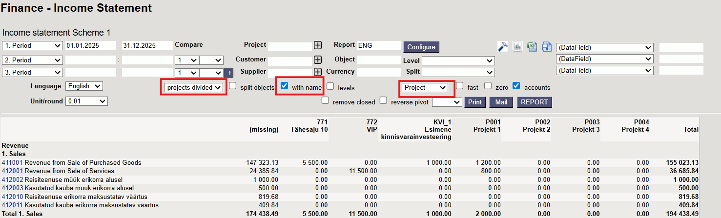 To display the income statement with project details, make the following selections (select the checkbox with name if you also want the names of the projects to be shown in the report):