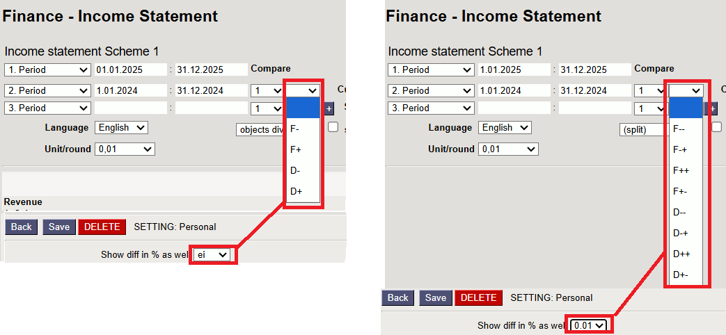 If the fine‑tuning option Show diff in % as well- is No, the percentage‑based comparison options will be hidden.