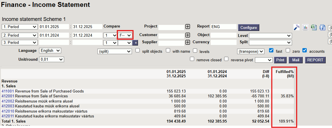 The source of the values for different periods can be either actual financial entries or budget entries with a specific code. The period values can be compared either from a difference perspective or from an execution perspective. To do this, select an option next to the comparable period, and define how the monetary and percentage differences are calculated.