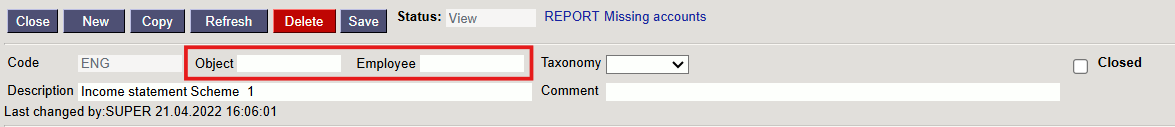 - Object - selectable by double‑clicking or using the right mouse button. If the income statement has to be for a specific object, then the Object field must be filled with the object for which the report should be generated. Object restriction – if Split objects is not selected, the restriction is interpreted strictly. This means that if the row contains LOCATION,PERSON, it will not match LOCATION or PERSON individually, but it will match LOCATION,PERSON exactly.