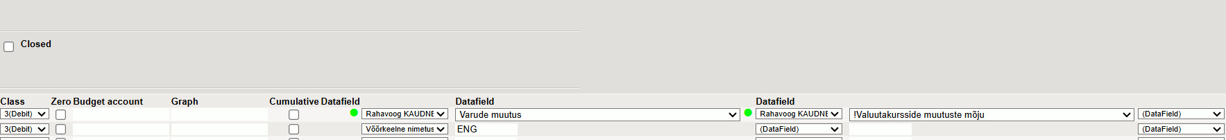 The income statement report line can be described as an account range, and an account dataField filter can be used to select a group of accounts for a report line. This allows entering the dataField values as text or selecting them from a list. The selection can also use dataField exclusion — “include all accounts except those marked with the specified account dataField”.