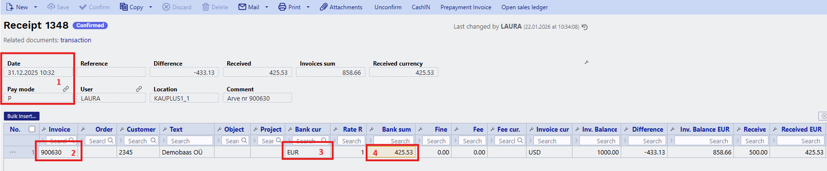 - Bank row - if a receipt is created from a bank statement, it shows which bank statement row it is related to. If the sum is divided between several invoices, when creating a receipt from a statement, then all these rows have the same statement row number in front of them. If it is necessary to change the sum of a row (for example, mark it as linked to other invoices or as prepayment), the receipt row must be deleted and the data placed again. In this case, the “Bank row” cell remains empty. (ON THE NEW RECEIPT DOCUMENT).