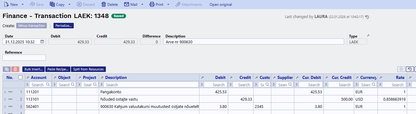 - Received EUR - informative field. Calculates the Received sum in currency of each receipt row into base currency with the rate of the receipt day.
