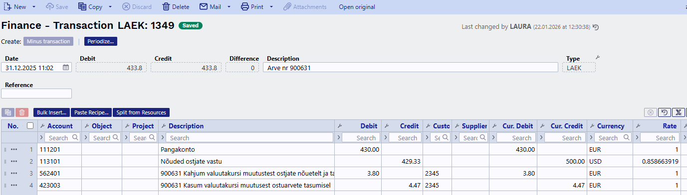 - Exchange rate differences are calculated automatically in the Financial transaction.