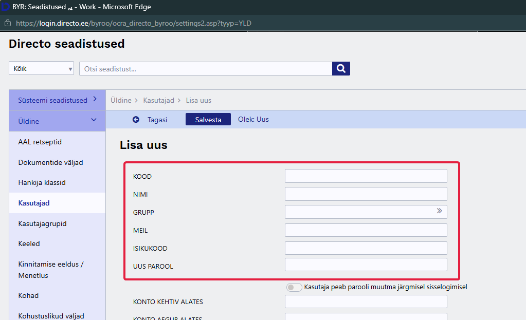 Igale kasutajale tuleks lisaks nimele täita ka isikukoodi lahter ning määrata, millised õigused tal on büroos. See ei puuduta õigusi konkreetsetes baasides, need määratakse kasutajagrupiga baasis.
