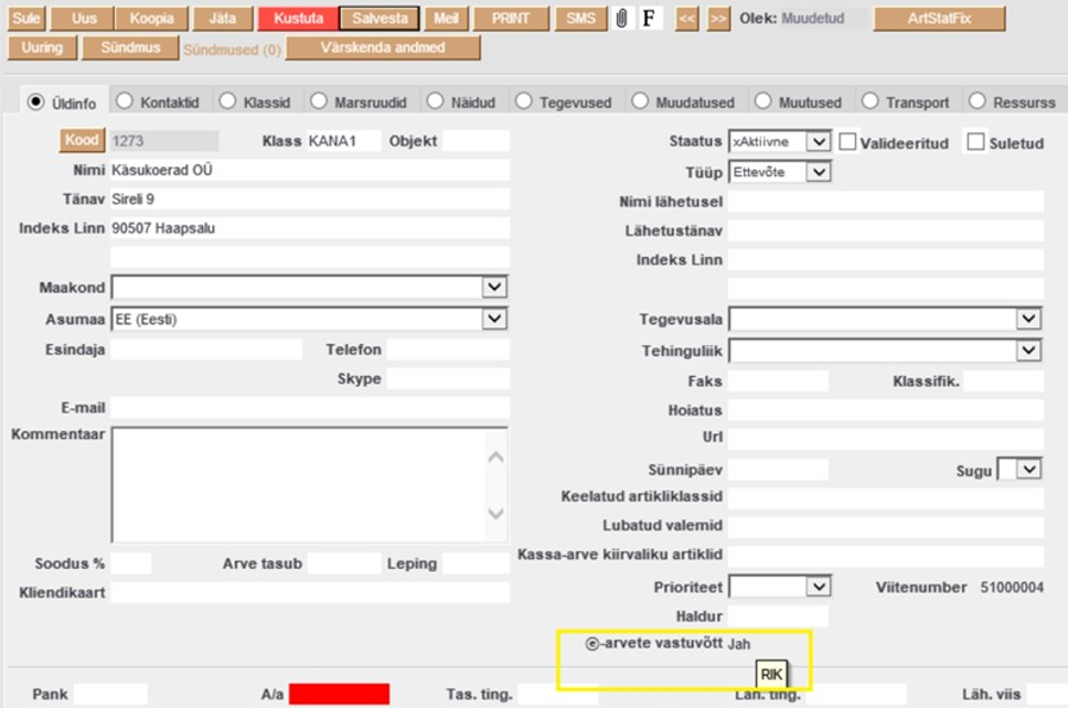 - Directos näed kliendikaardil välja ”e-arvete vastuvõtt” - kui seal on Jah, siis klient võtab vastu e-arveid. Info kuvatakse vastavalt äriregistri päringule kliendi registrikoodi alusel (igaöine).