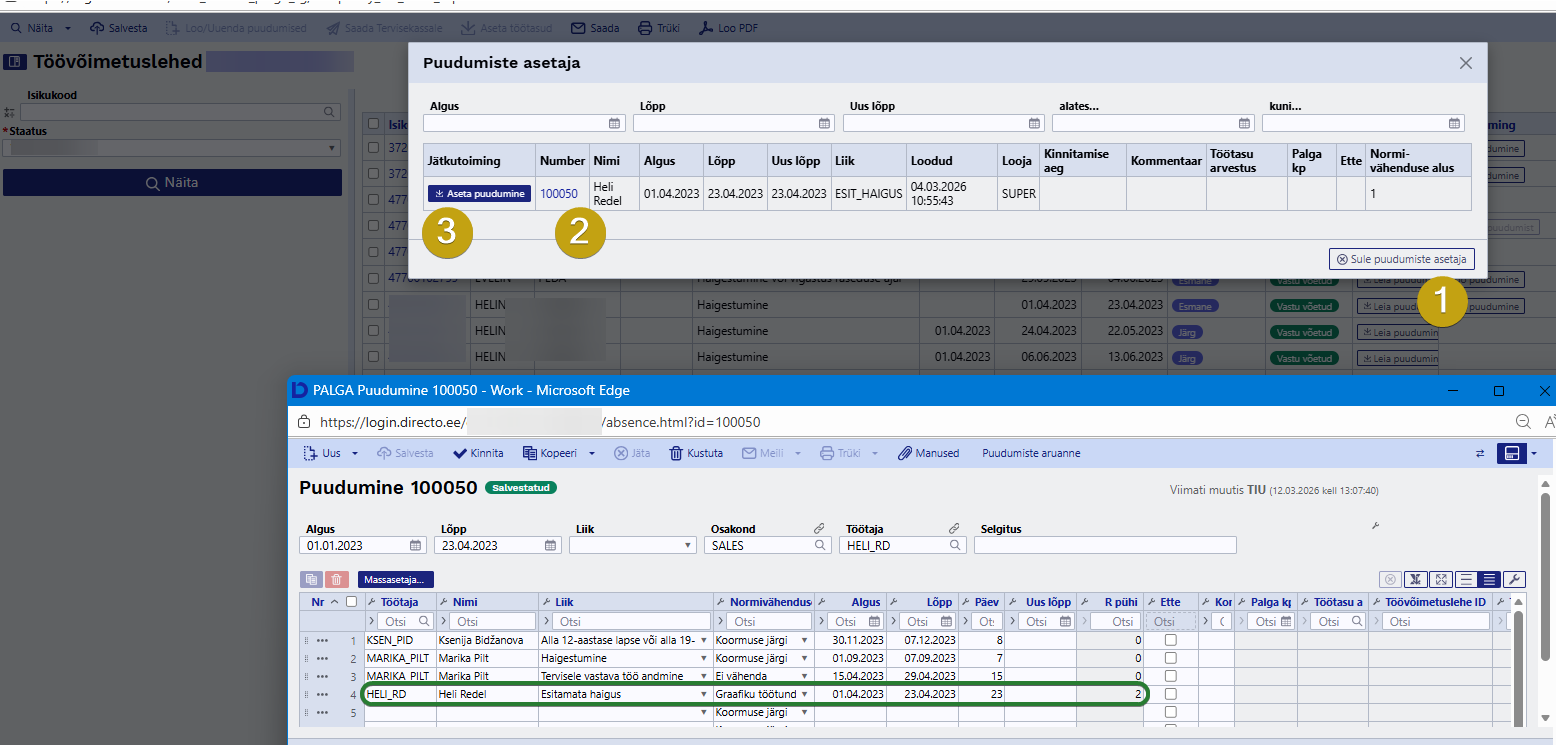 Kui tegemist on arsti poolt lõpetamata töövõimetuslehega, tuleb sul endal puudumine Directosse lisada.