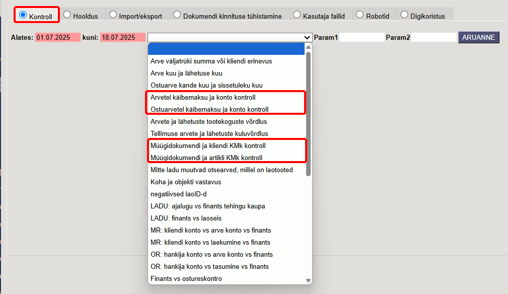 Seoses käibemaksu standardmäära tõusuga on oluline, et alates 1.7.2025 väljastatavatel arvetel oleksid kasutusel õiged käibemaksumäärad ning kogu käibemaksuarvestus oleks korrektne. 2025. aasta juulikuu käibedeklaratsioon tuleb esitada 20. augustil. Selleks, et vigade avastamine ei jääks liiga hilja peale, siis soovitame juba nüüd hakata jooksvalt dokumentidel käibemaksumäärade õigsust kontrollima. Selle jaoks soovitame kasutada kontrollaruandeid, millised leiate Raamat > Aruanded > Hooldus > nupu „Kontroll“ alt.