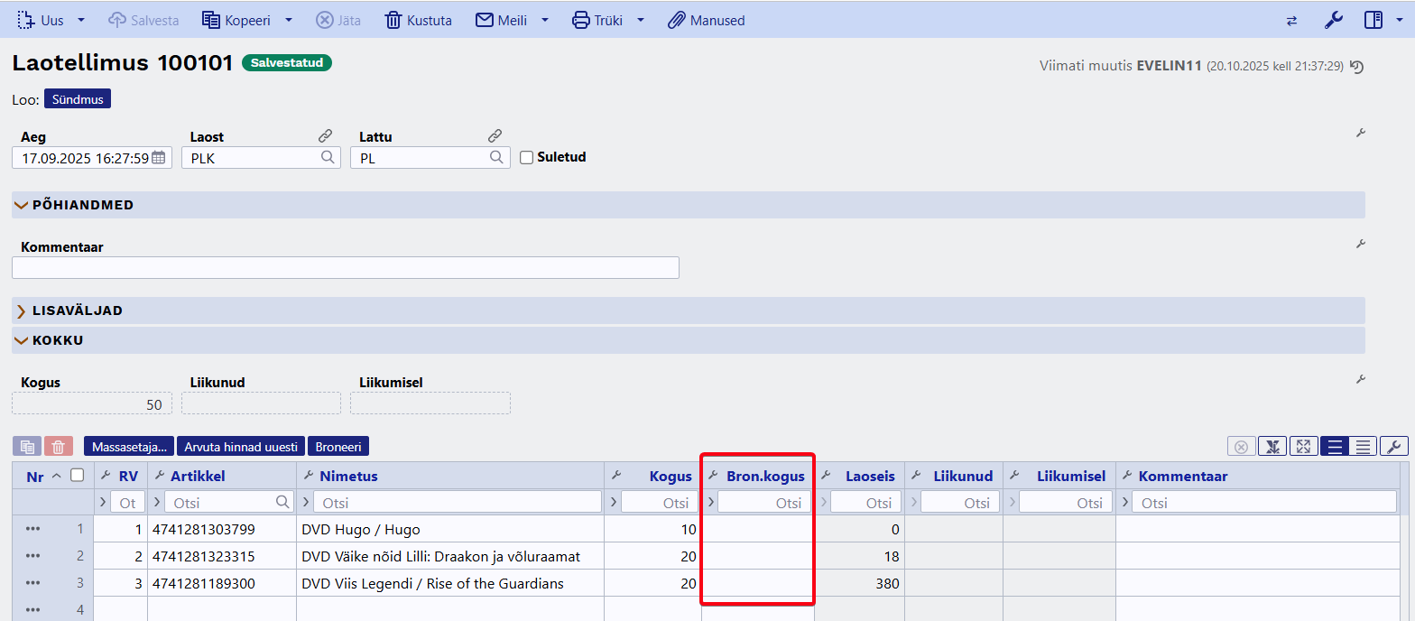 - Kui liikumisel muuta kogust suuremaks kui laotellimusel broneeritud, ei saa liikumist kinnitada.