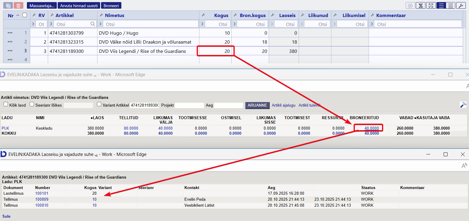 - Broneerimisel arvestatakse nii tellimuste kui laotellimuste broneeritud lähetamata/liigutamata koguseid. Kui kasutusel on ka müügitellimused ja lähetused, siis tuleb broneerida ka müügitellimusi.