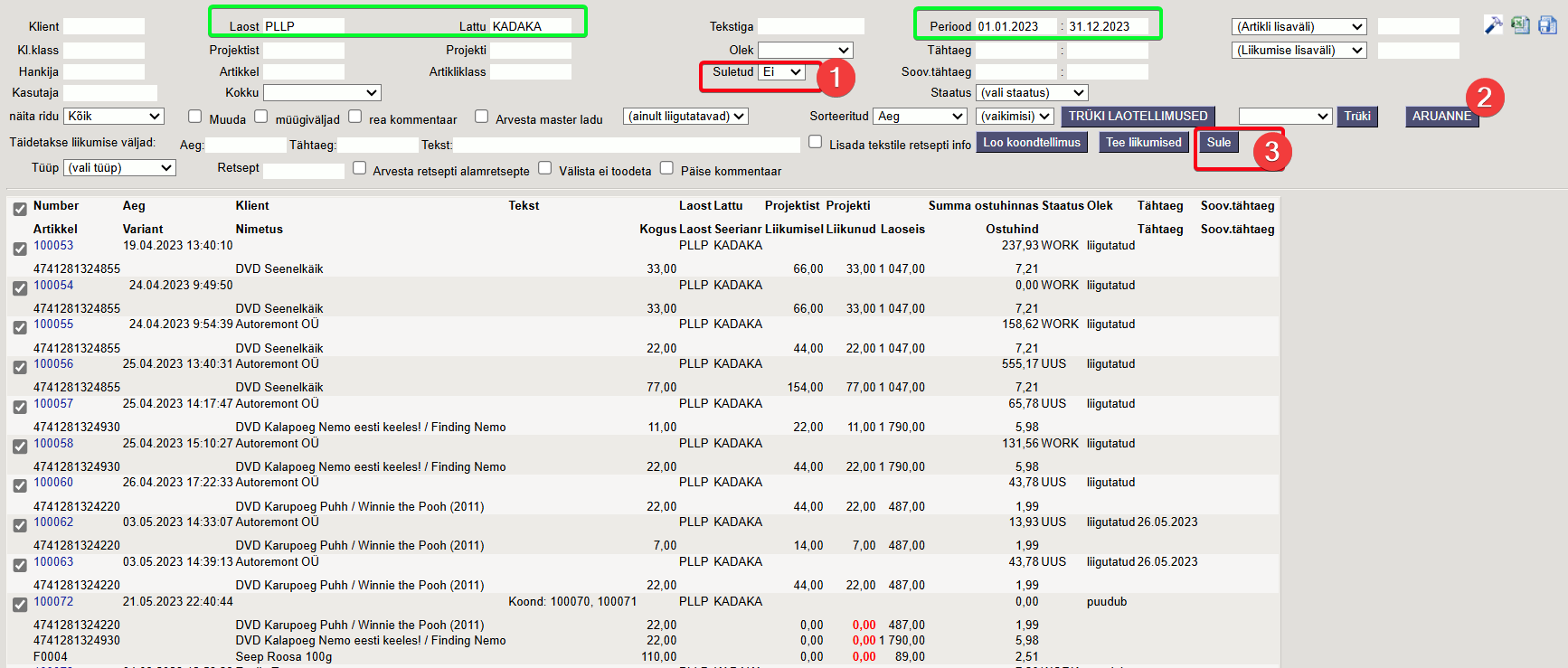 Laotellimuste sulgemiseks filtreeri aruandesse laotellimused, mida soovid sulgeda. Kindlasti vali filter Suletud=Ei, mille tulemusel ilmub aruandesse selle käivitamisel Sule nupp. Sule nupule vajutamisel suletakse kõik aruandes olevad linnutatud laotellimused (saad rea ees märkeruudust valida, milliseid ei suleta).