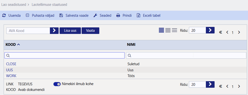 Laotellimuse staatuste register asub Seadistused > Lao seadistused > Laotellimuse staatused