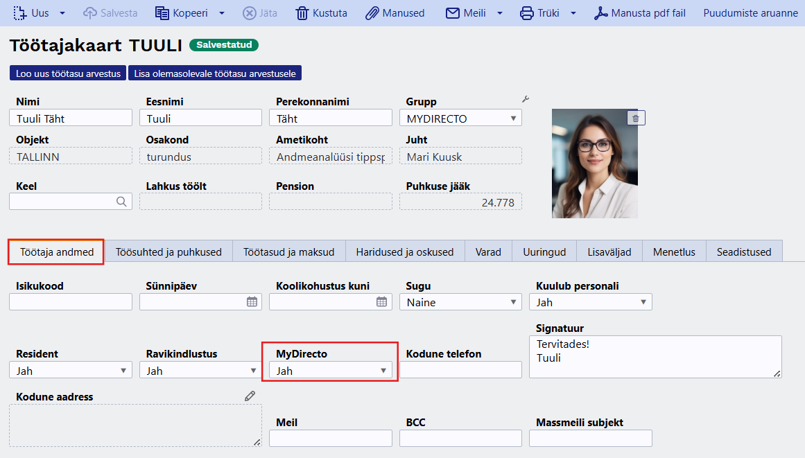 Töötajakaardil Töötaja andmed sakil saad peale MyDirecto aktiveerimist määrata, kas konkreetsel töötajal on õigus MyDirectosse logida või mitte.