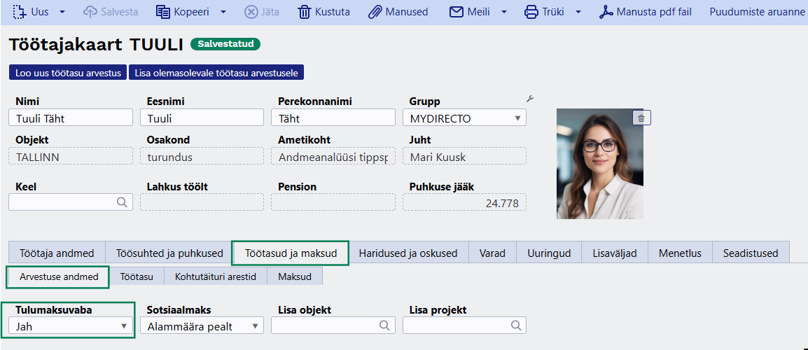 Kui töötajakaardil on seni olnud Tulumaksuvaba valikuga Ei ja nüüd soovitakse maksuvaba tulu arvestada, siis tuleks Tulumaksuvaba muuta Jah valiku peale.