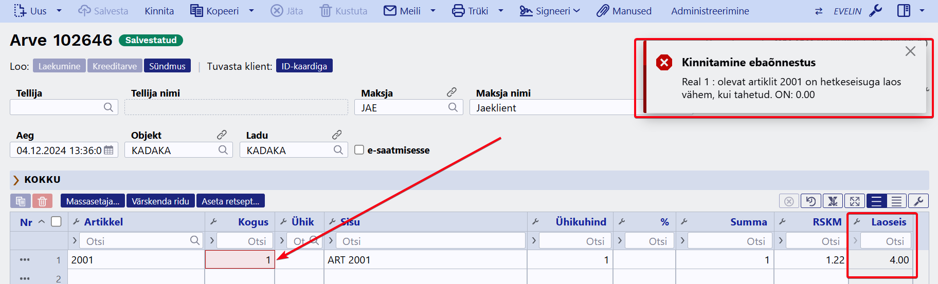 - Kinnita uuesti vanem arve nr 102646 (tekib seos õige Laoid'ga 6205).
