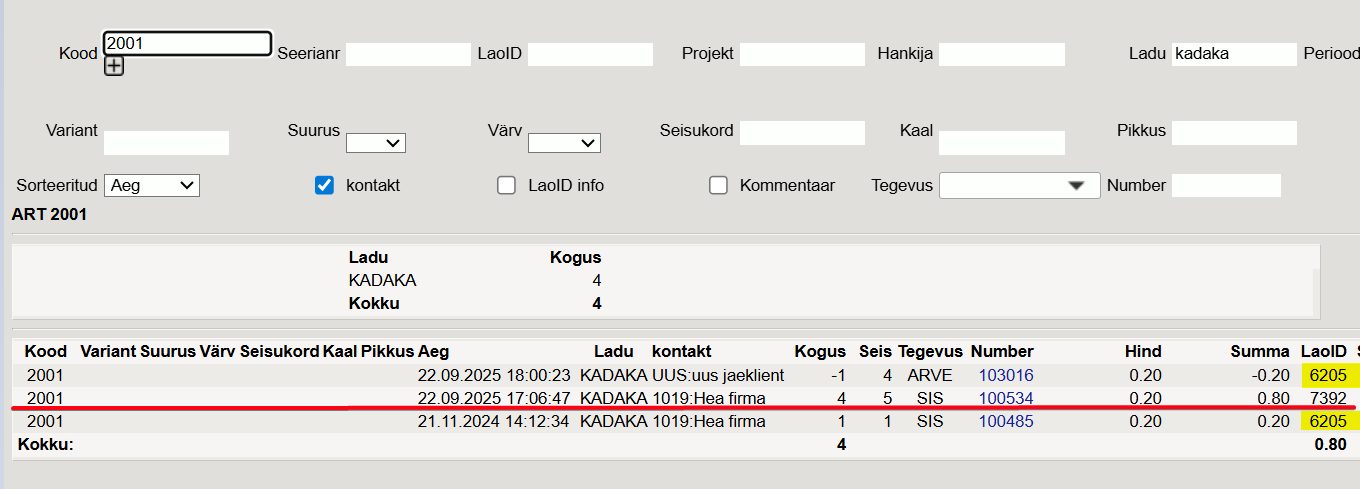Kui aga vaadata edasi Artikli ajalugu, siis on näha, et 22.09.2025 on toiminud nii müük kui ka uus sisseost. Arve kasutas ära FIFO meetodit kasutades varasemat Laoid'd (6205). Varem kinnitusest tühistatud arvet üritatakse kinnitada ajalukku aega, mida alloleval pildil tähistab punane joon. Selle aja Laoid on tulevikus ära kasutatud.