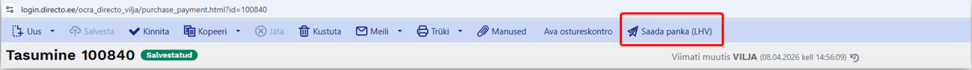 Loodud tasumised leiad aruandest Tasumised Ost → Aruanded → Tasumised, mille kaudu saad need üksikult või massiga kinnitada ja panka saata.