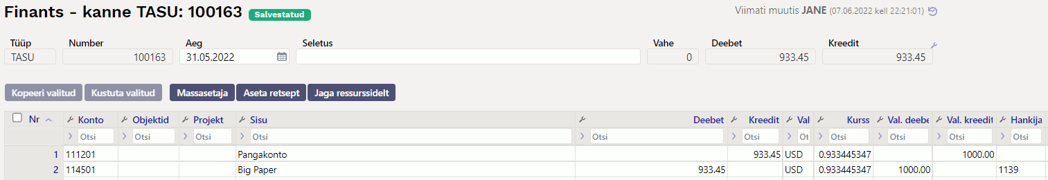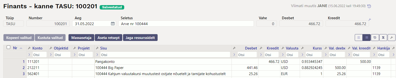 Valuutakurssidega seotud kasumite/kahjumite jälgimiseks on iga ostuarve valuutakursi kanne eraldi real ning kandereale on lisatud ostuarve number ja päise objekt.