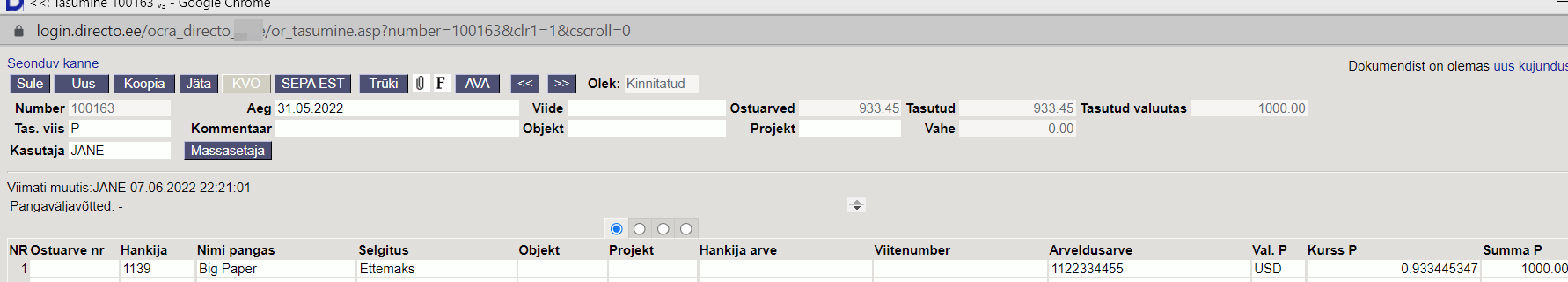 - Summa P väljale märgitakse summa, mis tasutakse s.t. pangast maha läheb 935.00