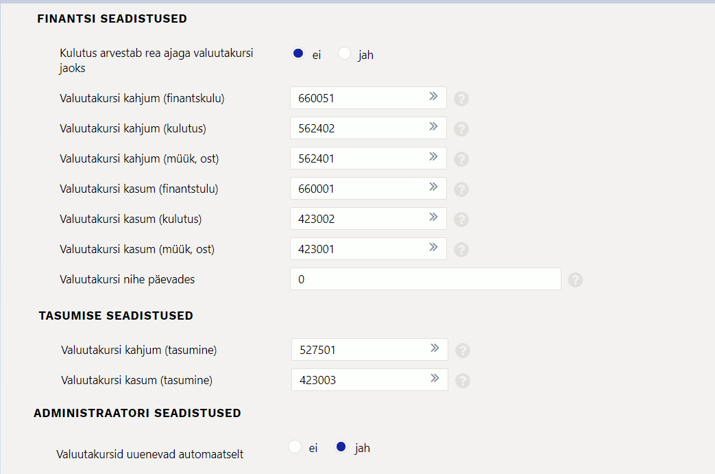 - Ostuarved - näidatakse ära tasumise ridadel ostuarvete summa kokku baasvaluutas. Valuutaostuarvete puhul ostuarve kuupäevaga valuutakursi järgi arvestatud ostuarvete summad.