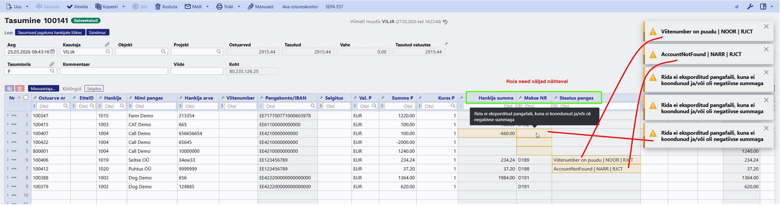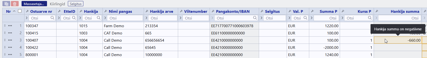 - Kirjuta hankija kood ja summa miinusmärgiga, salvestades valib FIFO meetodil EtteID. Nii asetades ei tule kaasa ettemaksu objektid ja projektid.