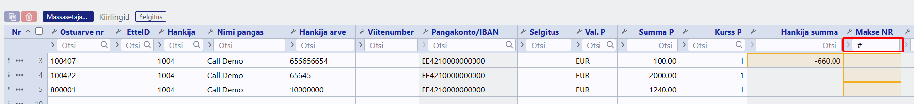 - Tasuti EUR - informatiivne tulp, mis arvutab iga tasumise rea valuutas tasutud summa baasvaluutasse tasumise päeva kursiga.
