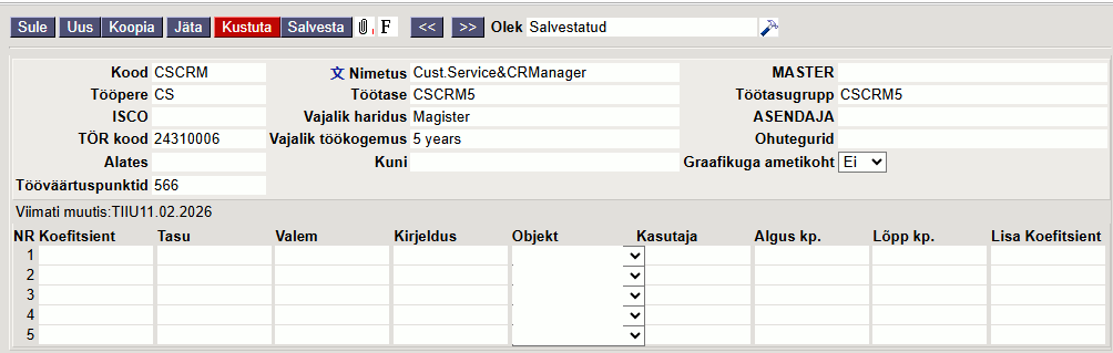Master- täidetakse hierarhiliselt kõrgema taseme ametikohaga. Master ametikohta saab asetada tehes väljal topelt hiirekliki, mille tulemusena avaneb ametikohtade register.