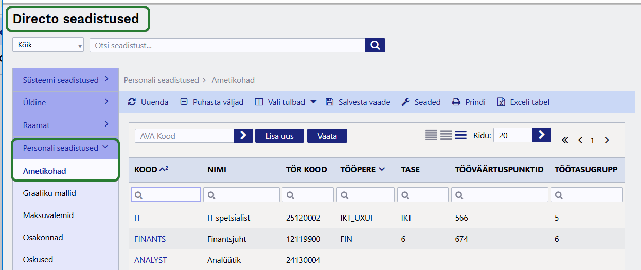 Ametikohtade register asub Seadistused → Personali seadistused → Ametikohad:
