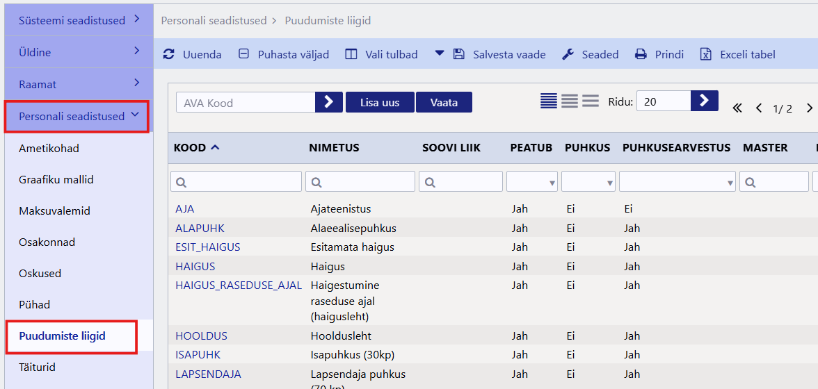 Puudumiste liigid asuvad Seadistused → PERSONALI SEADISTUSED→ Puudumiste liigid  :