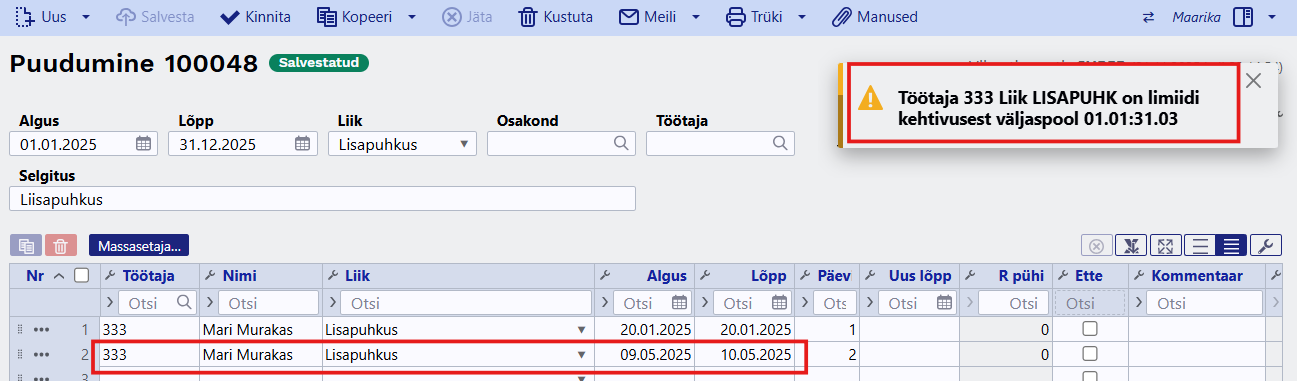 Kui päev ja kuu on puudumise liigile limiidi alguseks ja lõpuks määratud, siis selle puudumise liigi sisestamisel puudumise dokumendile valesse perioodi annab dokumendi salvestamisel hoiatuse, et puudumine on sisestatud valesse perioodi.